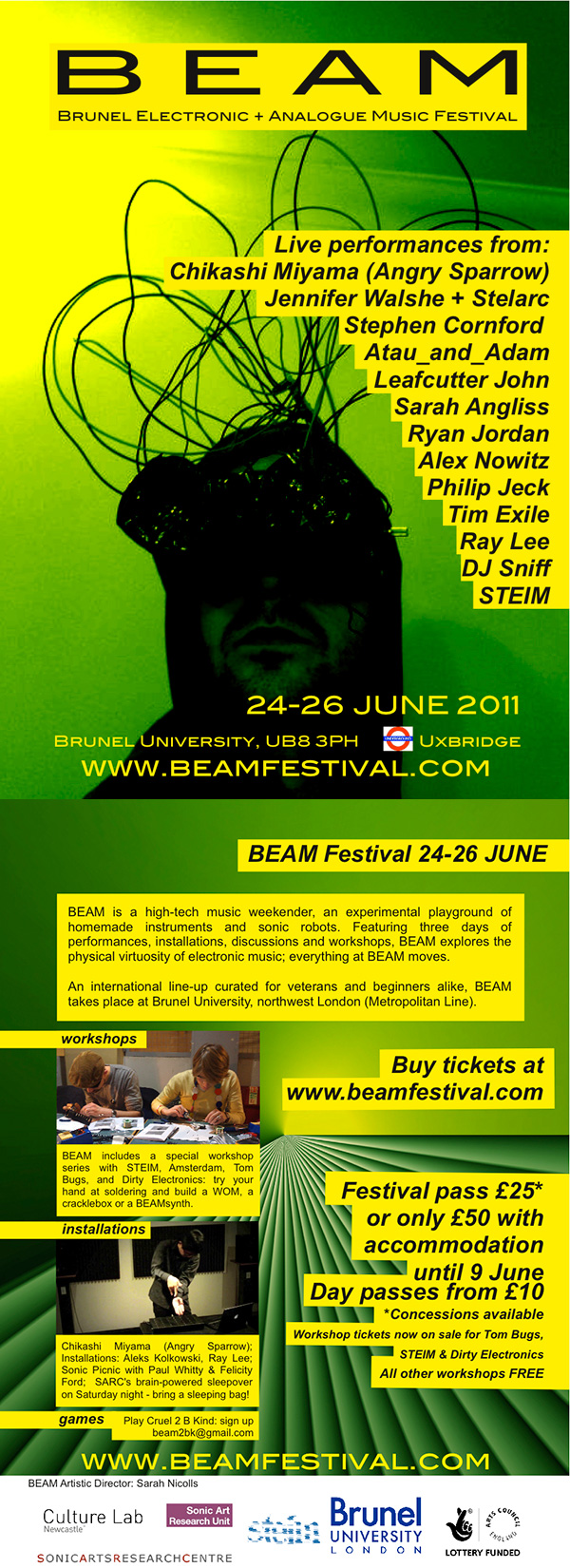 From the 24th-26th June, 2011, as part of the Beam Festival (Brunel University, Middlesex, UK) I will be presenting some performance recordings and compositions in their audio-visual gallery. 17 artists in total will be showing their work in the gallery. On the weekend there will also be performances and workshops.